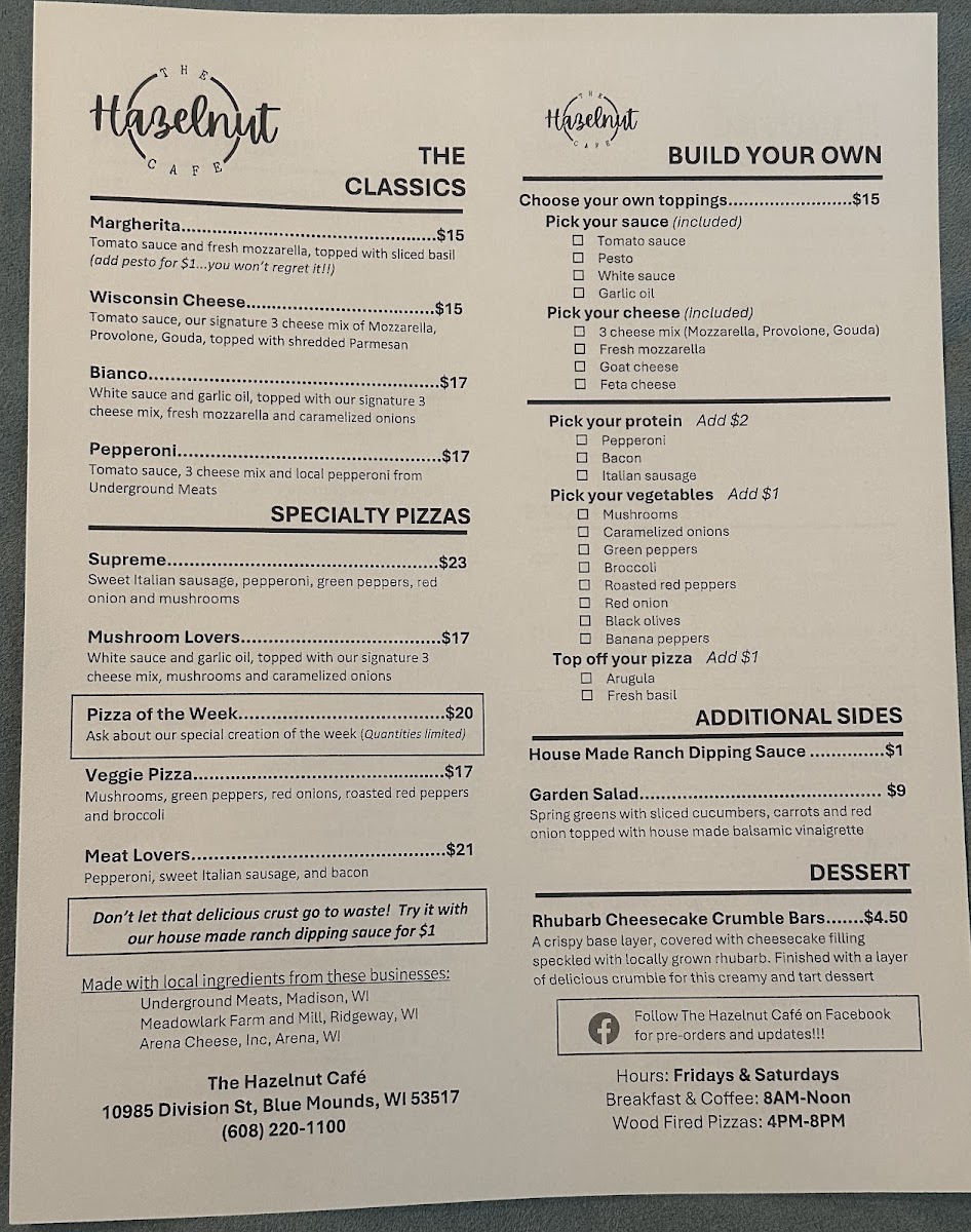 The Hazelnut Cafe Menu feels like discovering a cozy corner in Blue Mounds where comfort food meets a fresh, local spirit. It’s tucked away at 10985 Division St, and even from the first glance, you can sense the kind of place where people settle in for a warm meal rather than rush through the door. The dishes here lean toward hearty basics done right - think toasted sandwiches with golden edges, salads layered with crisp greens, and breakfast plates that seem to brighten the whole table.
